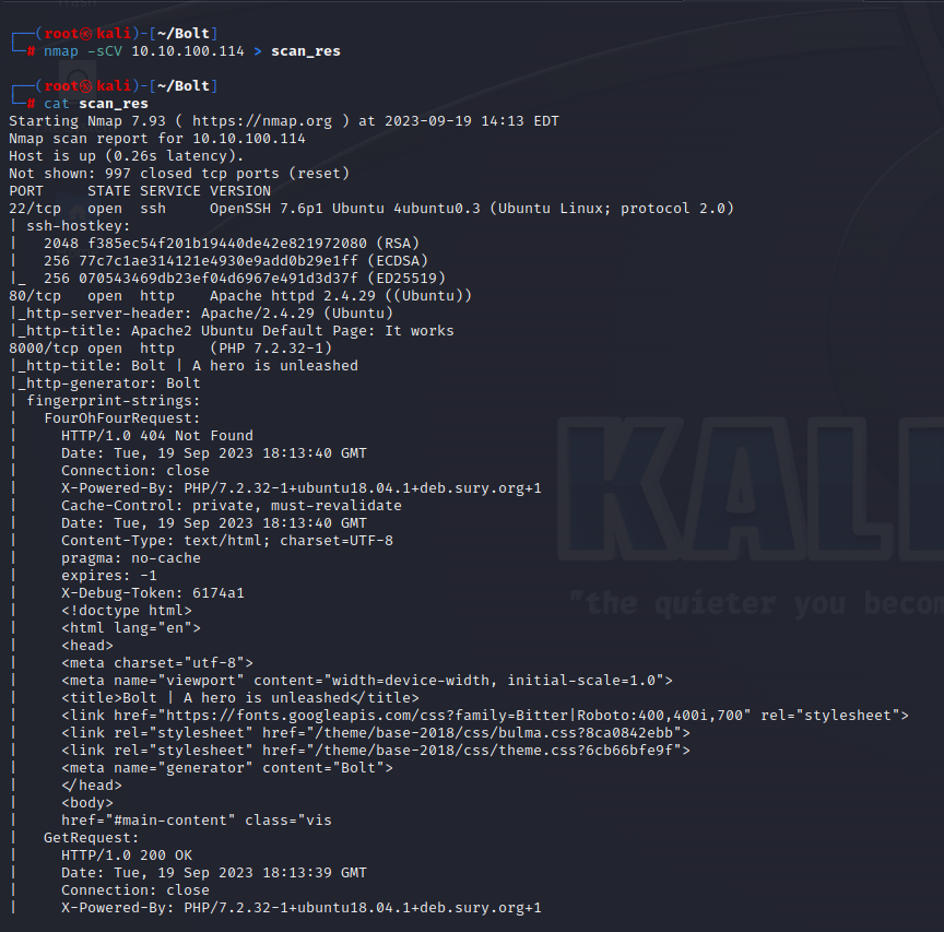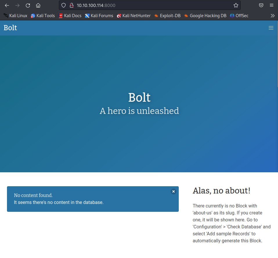 80번 포트에 연결된 서비스는 아직 개발되지 않은 초기의 웹 페이지인걸로 확인 했고, 8000번 포트는 Bolt CMS 라는 웹 서비스를 제공하는걸로 확인 됬다. 이제 메타스플로잇을 사용하여 Bolt CMS의 취약점을 찾는다.