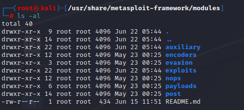 메타스플로잇에는 수천 개의 모듈이 존재한다. 모듈들은 각자의 기능에 맞는 7개의 디렉터리에 존재한다. 메타스플로잇 모듈들이 포함되어 있는 디렉터리 경로는 /usr/share/metasploit-framework/modules 에 존재한다.