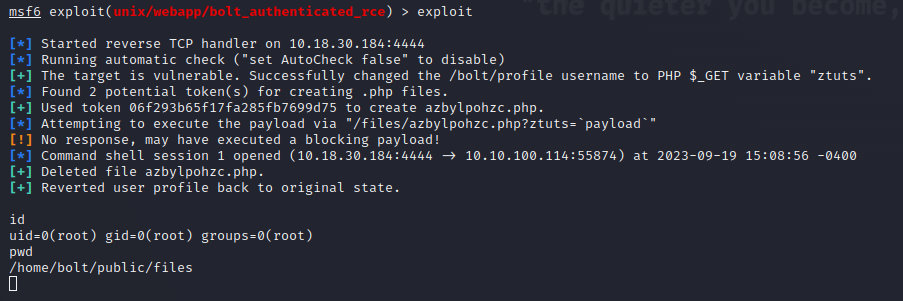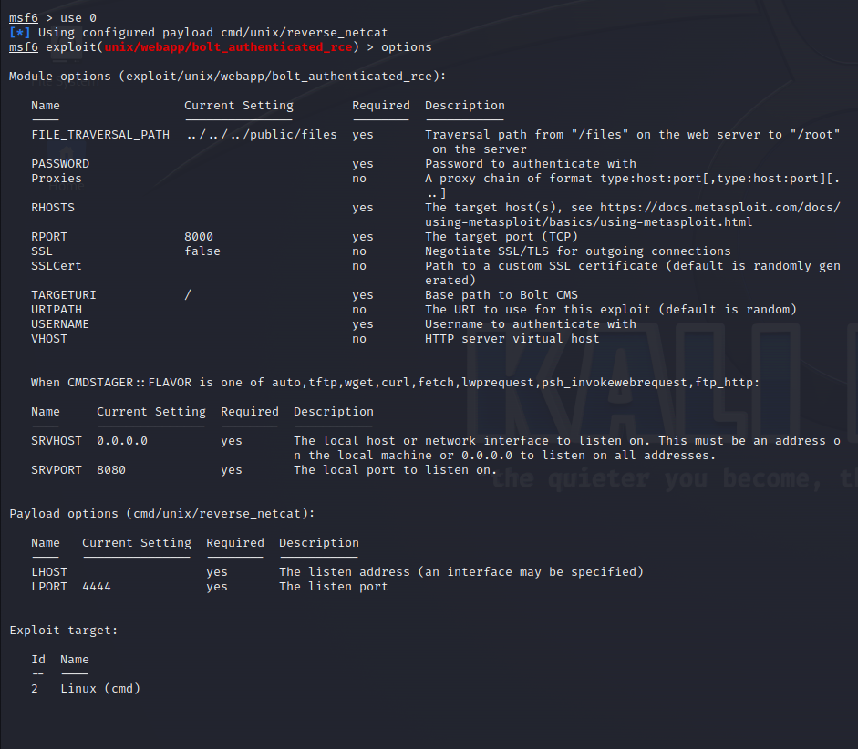 use 0 (혹은 취약점 이름 : exploit/unix/webapp/bolt_authenticated_rce)