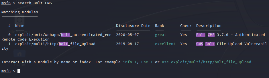 search 명령어를 사용하여 취약점을 찾을 수 있다. search [취약점 이름 또는 서비스 이름] 형식으로 명령어를 입력하면 대상에게 존재하는 취약점을 공격하는 모듈이 출력된다. 각 모듈에 대한 설명을 보고 싶다면 info [취약점 이름 또는 넘버링]을 입력해주면된다. 이번에는 exploit/unix/webapp/bolt_authenticated_rce이름의 모듈을 사용해보자.