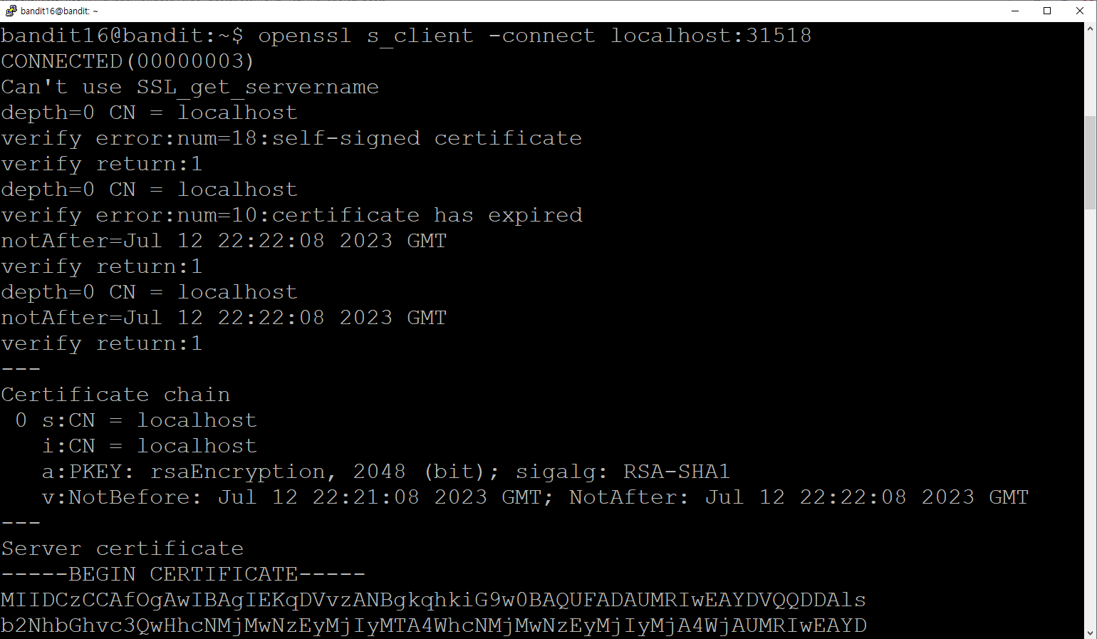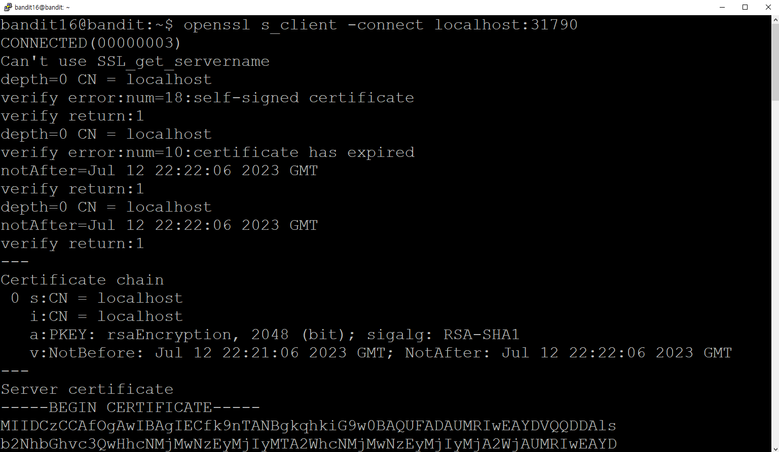 이번에는 31790 포트에 openssl 명령어로 연결 후에 현재 단계의 암호를 입력했더니 개인키(private key)가 출력되는 것을 확인할 수 있었다.