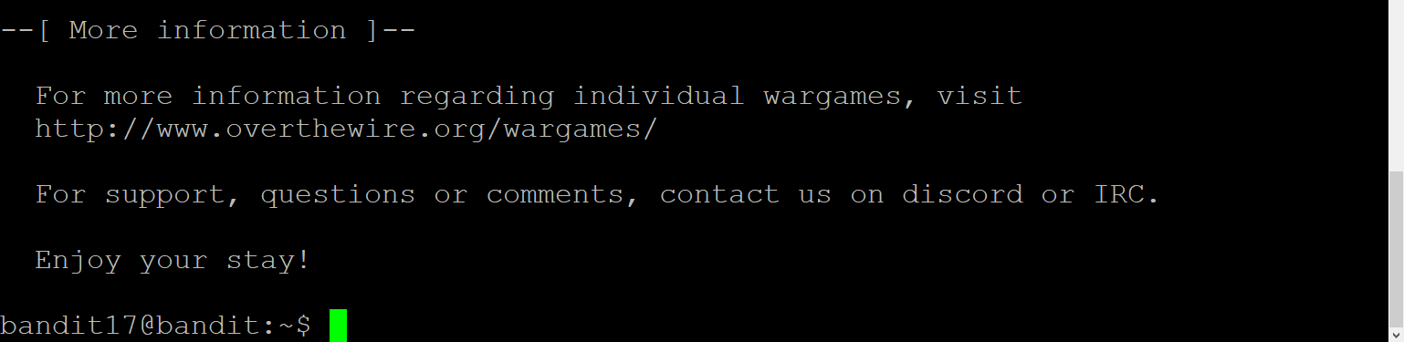 다시 ssh를 통해 연결을 시도해 주면 bandit17 계정으로 로그인을 할 수 있다.