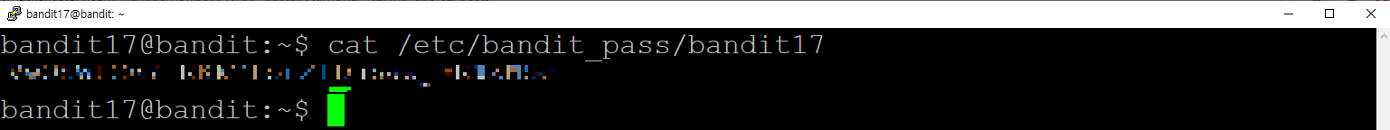로그인 후에 /etc/bandit_pass/bandit17을 cat 명령어를 사용해서 내용을 출력하면 bandit17 계정의 암호를 확인할 수 있다.