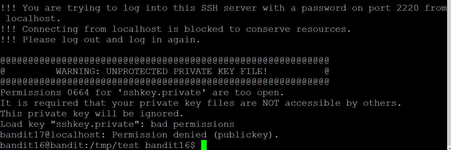 개인키도 얻었으니 bandit17 계정으로 ssh 연결을 시도해 본다. 그런데 경고문이 출력되고 로그인이 거부되었다. 알아보니 개인키 'sshkey.private'의 권한이 너무 오픈돼있다는 소리다. 즉, 개인키는 중요한 것이기 때문에 다른 사용자가 사용하지 못하게 권한을 부여하란 뜻이다.