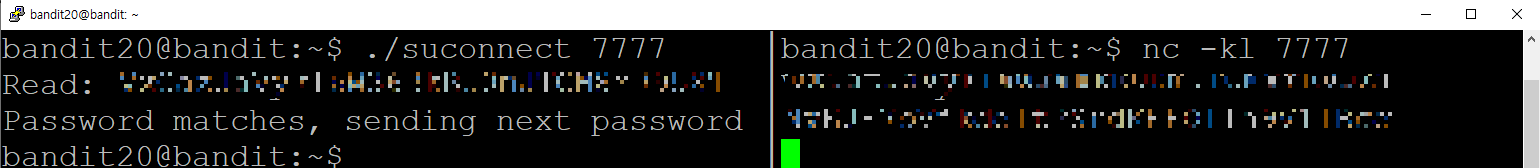 이후 포트를 연 test_bandit20 세션에 bandit20의 암호를 입력했더니 기본 세션에서 암호가 일치하는지 텍스트가 출력되면서 알려준 후에 test_bandit20 세션에 다음 단계 bandit21 계정의 암호를 출력하였다.