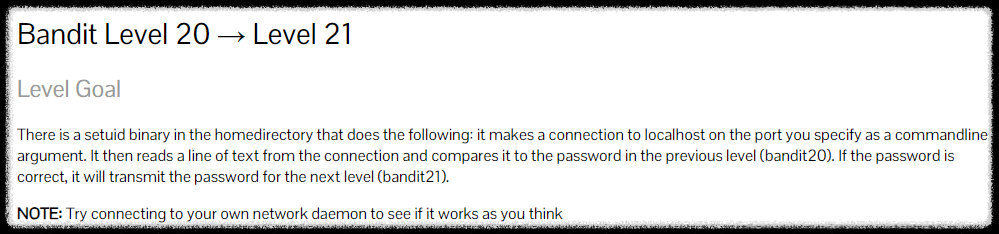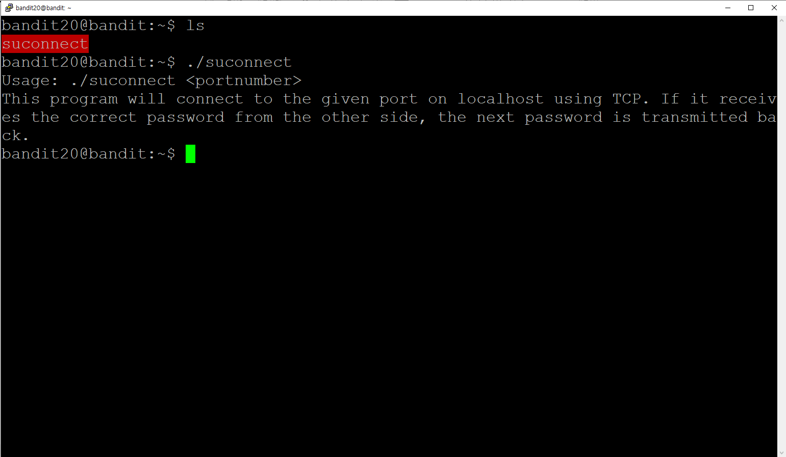 홈 디렉토리에는 다음 명령을 수행하는 setuid 바이너리 파일이 있다고 한다. 매개변수로 지정한 포트에서 localhost에 연결 후에 한 줄의 텍스트를 읽고 bandit20 계정의 암호와 비교한다. 암호가 일치하면 다음 단계 bandit21 계정의 암호를 전송한다고 한다.