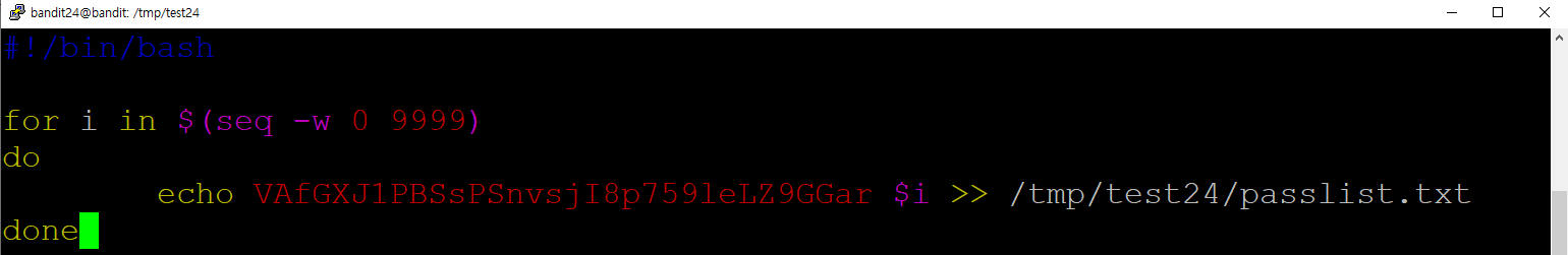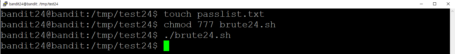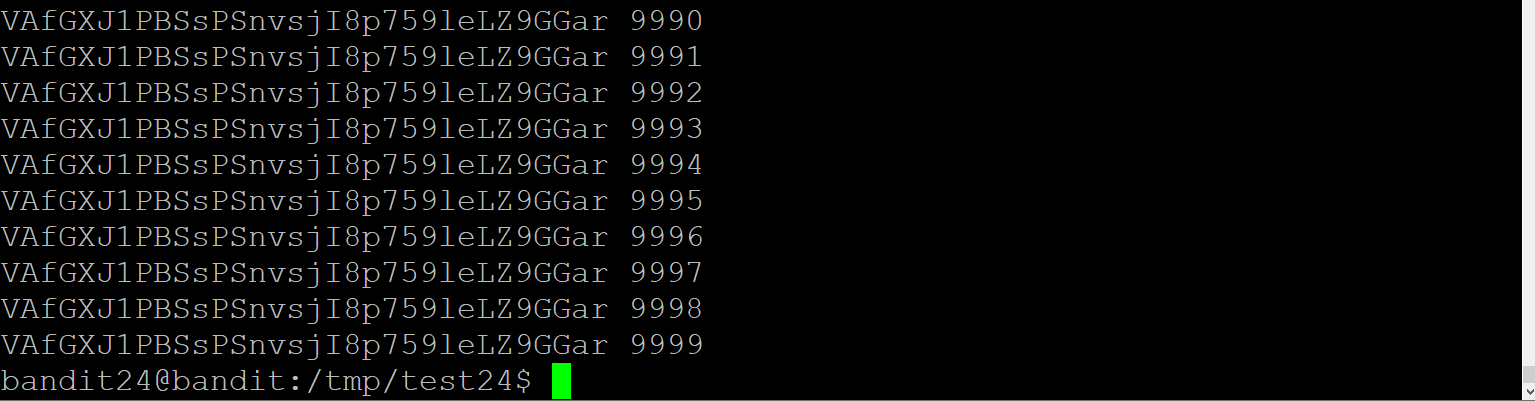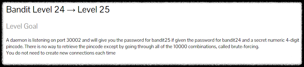 다음 단계로 넘어가는 암호는 수신 대기 중인 포트 30002에 bandit24 계정의 암호와 4자리 핀코드를 입력하면 얻을 수 있다고 한다. 이때 4자리 핀코드를 입력 시 brute-forcing이라고 하는 10000개의 조합을 모두 통과하는 것 외에는 방법이 없다고 한다.