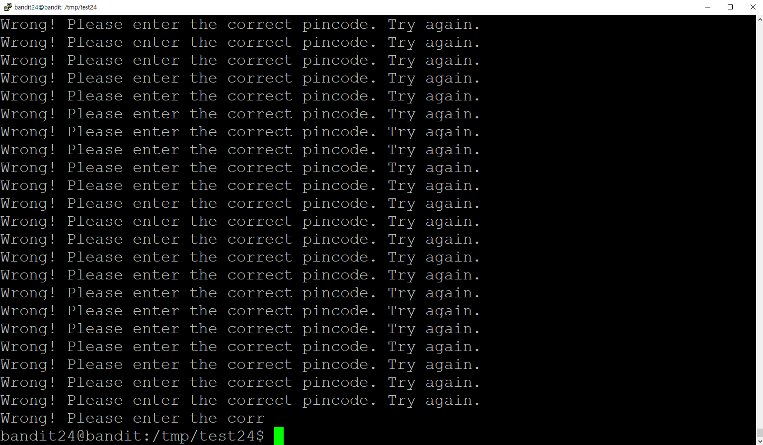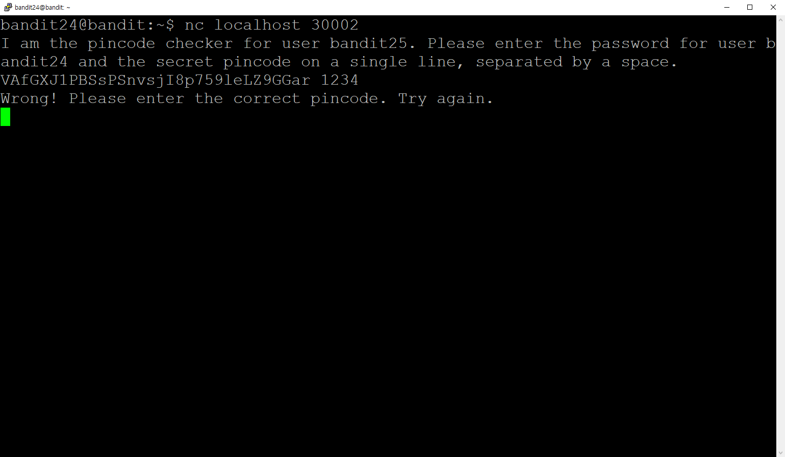 문제에서 30002포트가 수신 대기 중으로 나와 있으니 nc 명령어를 사용해서 연결을 시도하면 "I am the pincode checker for user bandit25. Please enter the password for user bandit24 and the secret pincode on a single line, separated by a space."라는 텍스트가 출력된다. 텍스트에 따르면 bandit24 계정의 암호와 4자리 숫자를 공백으로 구분하여 한 줄로 입력해야 한다. 그래서 문제의 파악을 위해 시험 삼아 입력을 하면 잘못된 핀코드라고 하니 다시 시도해야 한다는 텍스트가 출력된다.