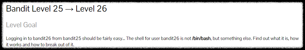 bandit25 계정에서 bandit26 계정에 로그인하는 것은 꽤 쉽다고 한다. bandit26 계정의 쉘은 /bin/bash 가 아니라 다른 것이며 그것이 무엇인지, 어떻게 작동하는지, 어떻게 탈출하는지 알아보시오.