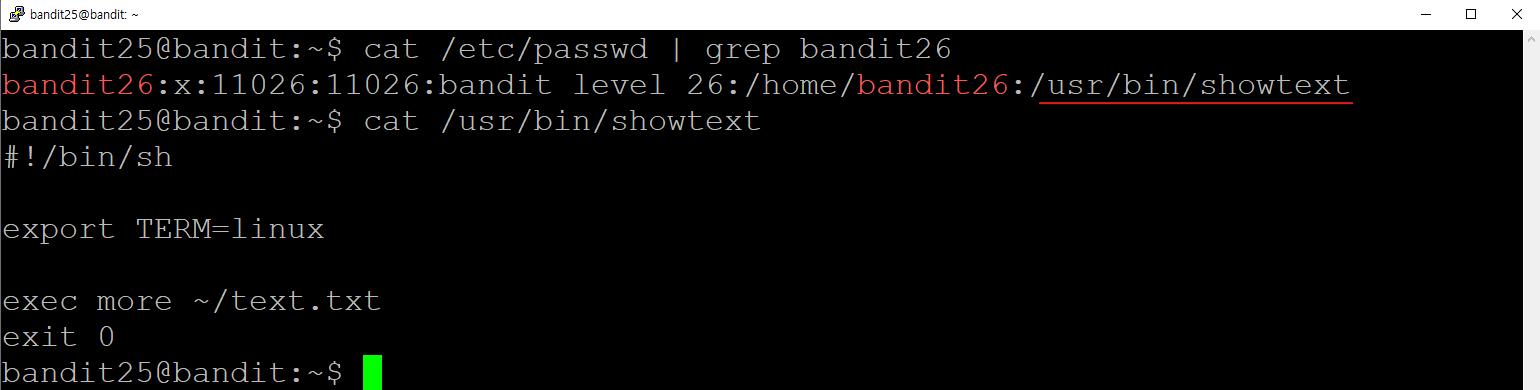 /etc/passwd 파일은 이 시스템에 존재하는 계정 정보가 저장된 파일이다. 이 파일에서 각 계정의 로그인 쉘을 확인할 수 있다. 빨간 줄 그어진 곳이 bandit26 계정의 로그인 쉘이다. 평소에 보던 쉘의 형식이 아니고 다른 형식인데 cat 명령어를 사용해서 내용을 확인해 보았더니 쉘 스크립트 파일이었다. 쉘 스크립트 파일의 내용을 보면 로그인 시 'more ~/test.txt' 명령을 실행 후 종료 한다는 내용인데 아무래도 bandit26 계정의 홈 디렉토리에 있는 text.txt 파일의 내용은 bandit26 이란 큰 텍스트 일 것이다.