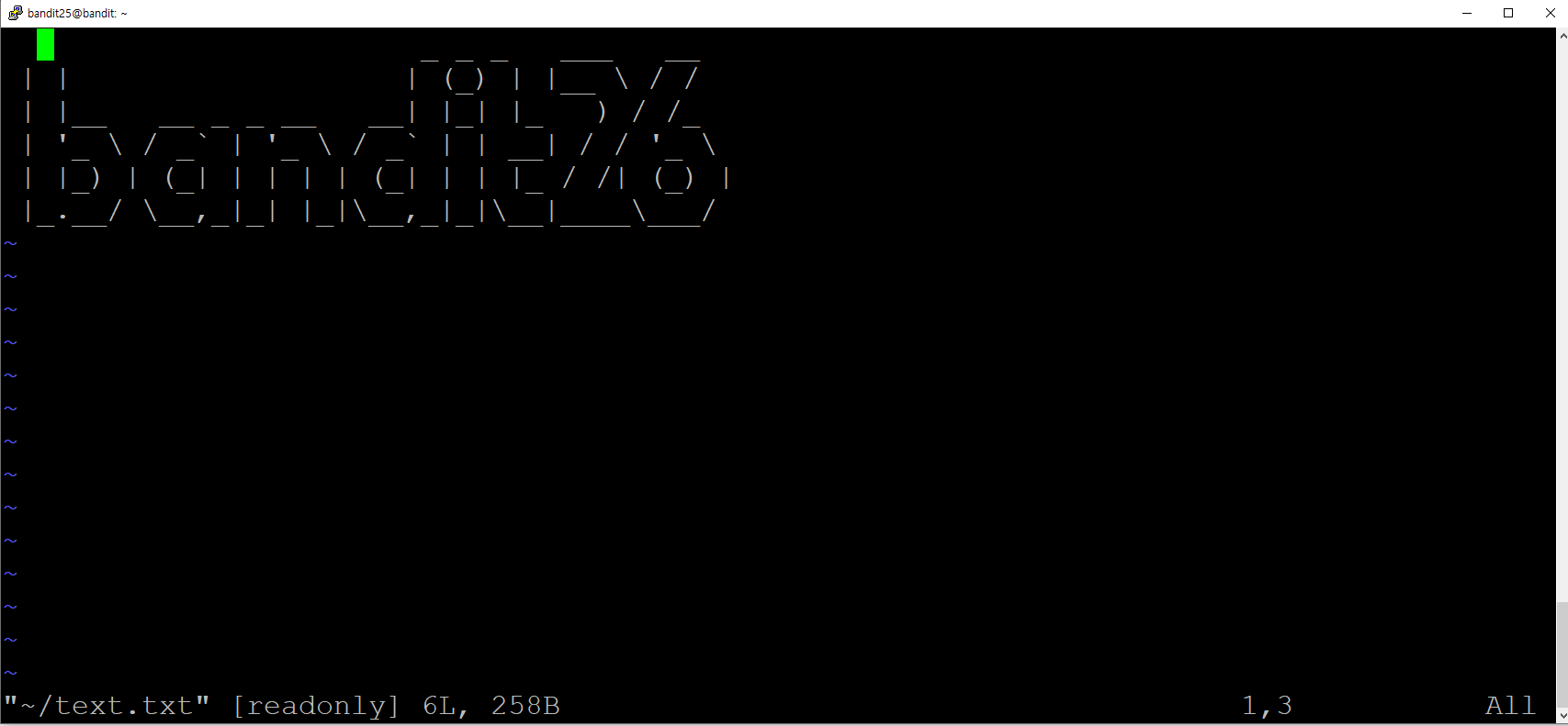 이 상태에서 'v' 버튼을 누르게 되면 vi 기능을 사용할 수 있다. 그렇다면 이제 여기서 bandit26 계정의 암호 파일을 불러와 확인할 수 있다.