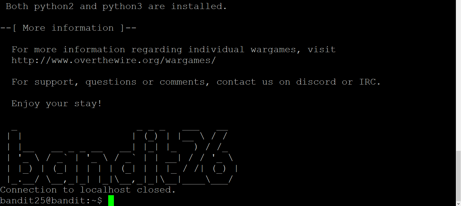 bandit26 이란 큰 텍스트가 출력되고 연결이 끊어졌다. 그렇다면 이제 bandit26 계정의 쉘이 어떤 건지 알아보도록 하자.