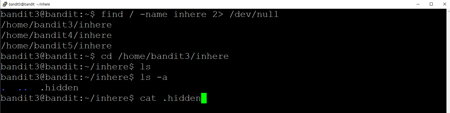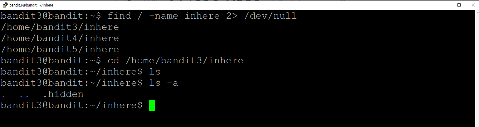 명령어를 사용하게 되면 3개의 결과를 찾을 수 있는데 현재 문제가 bandit3 이므로 bandit3에 있는 'inhere' 디렉토리로 이동해준다.