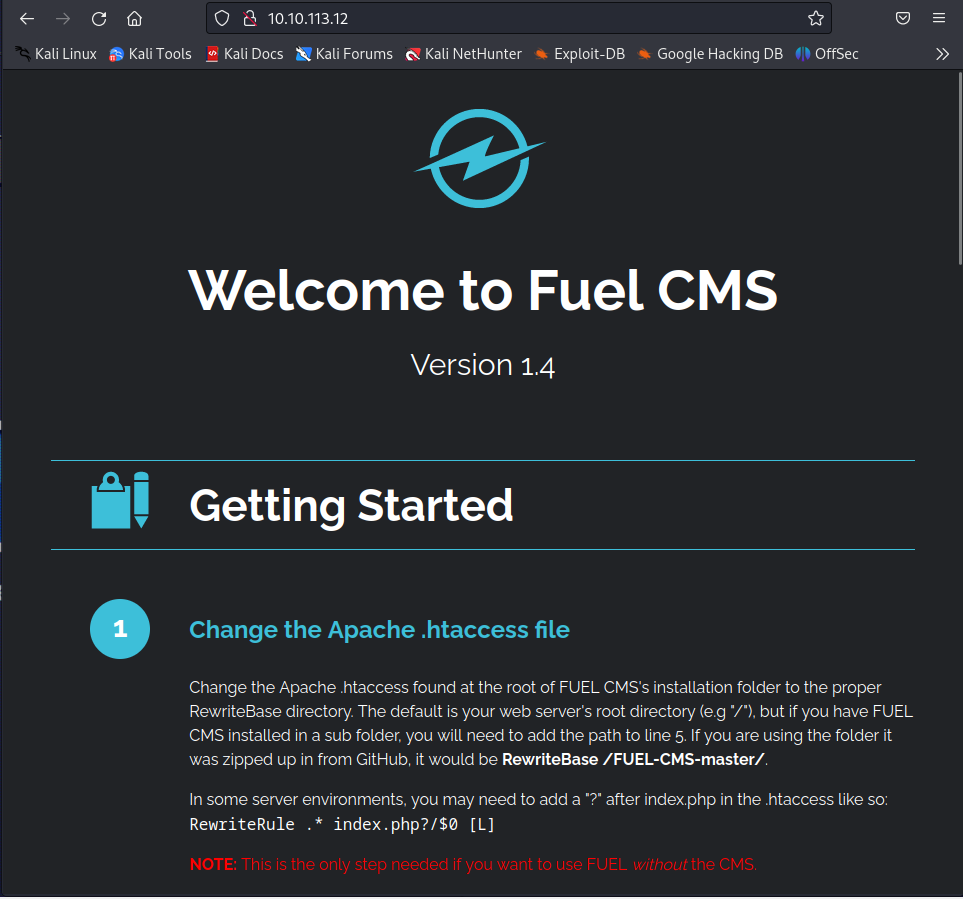 공격대상의 IP 주소를 웹 브라우저에 입력했더니 Fuel CMS에 관한 설명이 나와있는 웹 페이지가 나타났다.