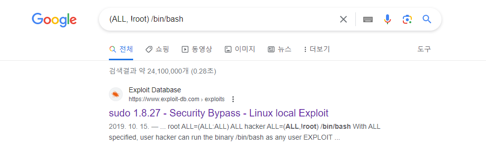 해당 권한이 부여되어 있으면 CVE-2019-14287라는 취약점을 사용할 수 있는 정보를 알 수 있었으며 해당 취약점은 sudo version이 1.8.28 이하의 version에서만 가능한 취약점이라 공격대상 시스템의 sudo version을 확인해 봤더니 적용 대상인 것을 알 수 있었다.