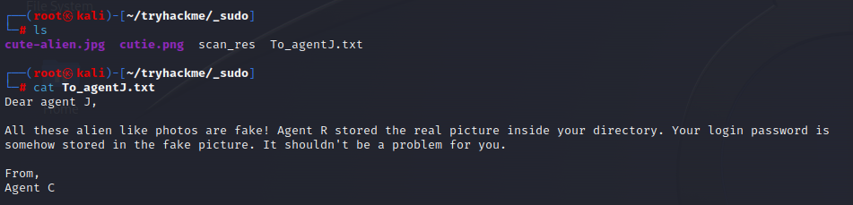 전송한 파일 중 To_agentJ.txt에는 새로운 코멘트가 적혀있었다. 해당 코멘트의 내용은 모든 외계인 사진은 전부 가짜이며 요원 R이 진짜 사진을 요원 J의 홈 디렉터리에 저장하였다고 한다. 또한 J의 로그인 비밀번호는 이 가짜 사진에 저장되어있다고 한다.