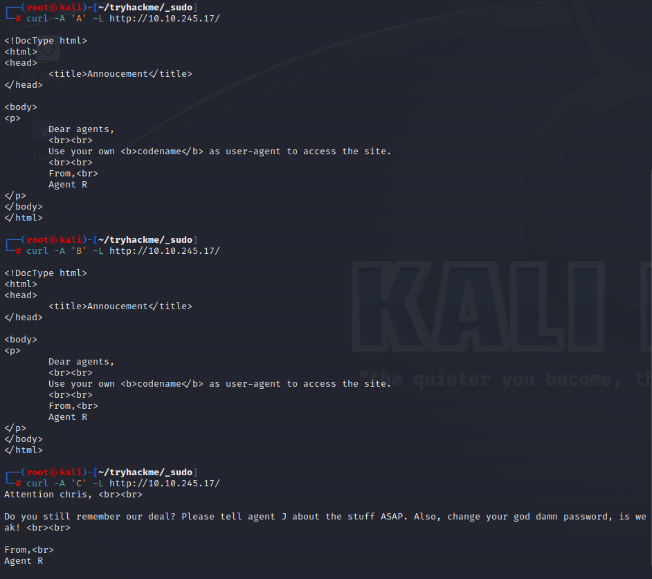 user-agent 헤더값에 대문자 알파벳을 순서대로 입력하여 curl 명령어를 실행했더니 codename이 "C"인 요원의 코멘트가 출력되었다. 해당 코멘트에서는 codename "C"의 이름이 "chris"라는 점과 비밀번호가 취약하다는 정보를 알 수 있었다.