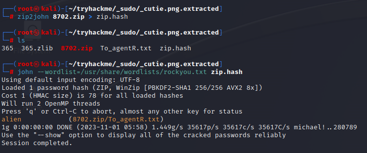 우선 zip 파일을 압축해제하려 했으나 비밀번호가 필요하였다. zip2john 명령어를 사용하여 john 도구를 사용할 수 있는 형식으로 만들어서 비밀번호를 브루트 포싱 한다. 그 결과 'alien'이라는 비밀번호를 확인할 수 있었다.