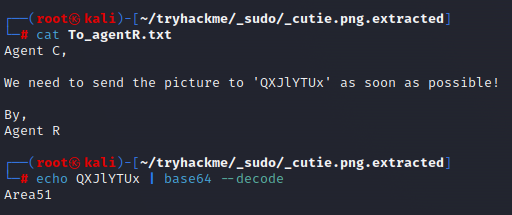 압축해제하여 나온 파일인 To_agentR.txt의 내용을 출력해 본 결과 코멘트가 적혀 있었다. 해당 코멘트의 내용은 별 내용이 아니나 'QXJlYTUx'라는 문자열이 의심이 되어 base64로 디코딩해봤더니 'Area51'라는 문자열을 확인할 수 있었다.