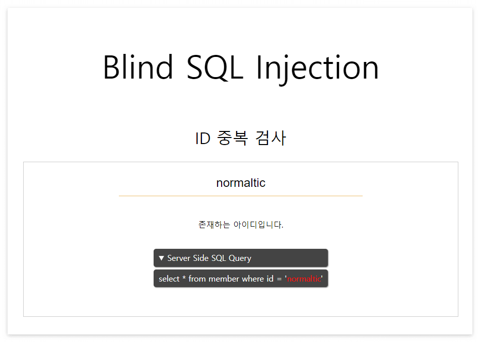 Blind SQL Injection 공격에 사용될 실습용 웹 어플리케이션으로서 ID 중복 검사 기능을 가진 프로그램이다. ID를 입력하면 해당 ID가 DB에 존재하는지 확인하여 존재여부에 대한 결과를 출력한다.
