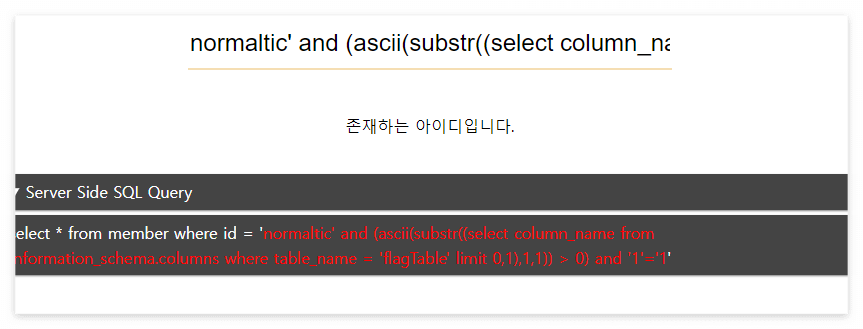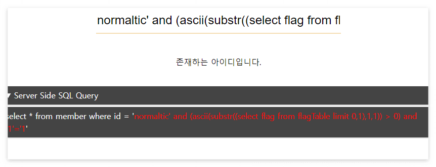 normaltic' and (ascii(substr((__'입력할 질의문'__),1,1)) > 0) and '1'='1