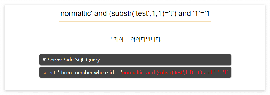 substr 함수를 사용함으로써 반복 작업을 좀 더 편리하게 만들어준다. Payload는 빨간색 숫자를 계속 변경하여 'test' 해당 위치에 맞는 문자일 시 그 결과값으로 참을 반환한다.