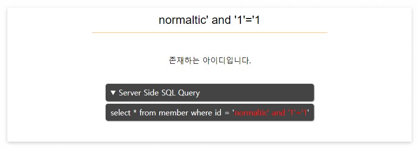 질의문이 삽입될 위치에 조건문 하나를 삽입하여 정상 작동하는지 테스트한다. Payload의 결과값은 해당 위치에 삽입될 조건문의 결과에 따라 달라진다.