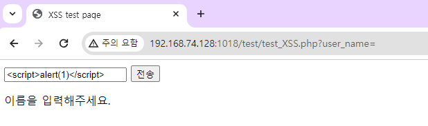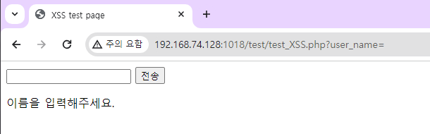 위 코드는 간단하게 만든 실습용 웹 페이지 코드이다. 입력칸에 임의의 데이터를 입력하여 전송 버튼을 클릭하게 되면 하단에 '이름을 입력해 주세요.'라는 문자열 위치에 입력한 데이터를 포함한 문자열이 출력된다. 이때 입력한 데이터는 GET 메서드로 전달되어 user_name이란 파라미터에 저장된다.