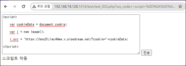 본격적으로 쿠키를 탈취 하기 위해 쿠키 탈취 공격 스크립트를 textarea 태그에 입력한다. 전송 버튼을 클릭하게 되면 스크립트가 작동되어 공격자 웹 서버에 요청 로그가 나타나게 된다.