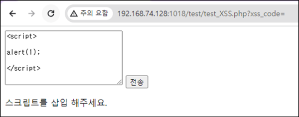 스크립트를 삽입 시 정상 작동하는지 직관적으로 확인하기 위해 Javascript 함수 중 alert() 함수를 주로 사용한다. alert() 함수는 괄호 안에 쓰인 데이터 내용을 팝업창으로 보여주는 함수이다. 그렇다면 입력칸에 <script>alert(1)</script>를 입력하고 전송 버튼을 클릭해 보자.