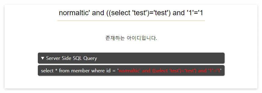 질의문이 삽입될 위치에 조건문 하나를 삽입하여 정상 작동하는지 테스트한다. Payload의 결과값은 해당 위치에 삽입될 조건문의 결과에 따라 달라진다.