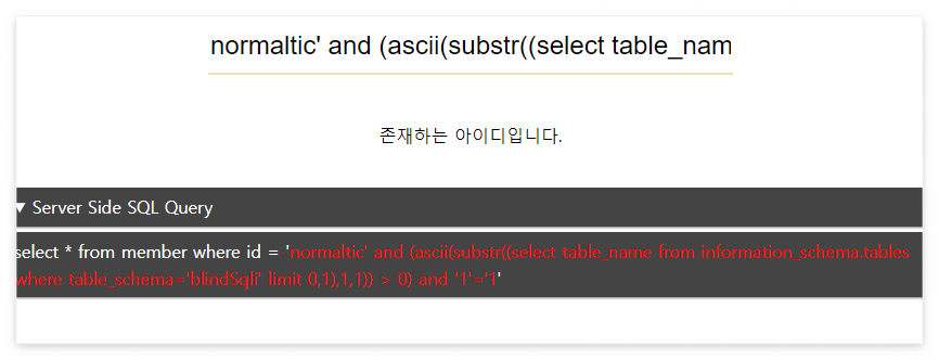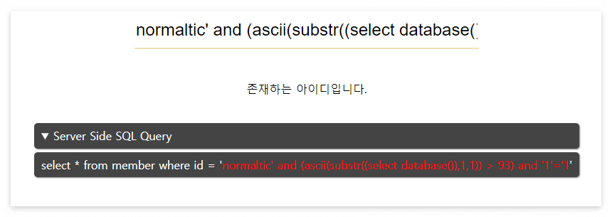 normaltic' and (ascii(substr((__'입력할 질의문'__),1,1)) > 0) and '1'='1